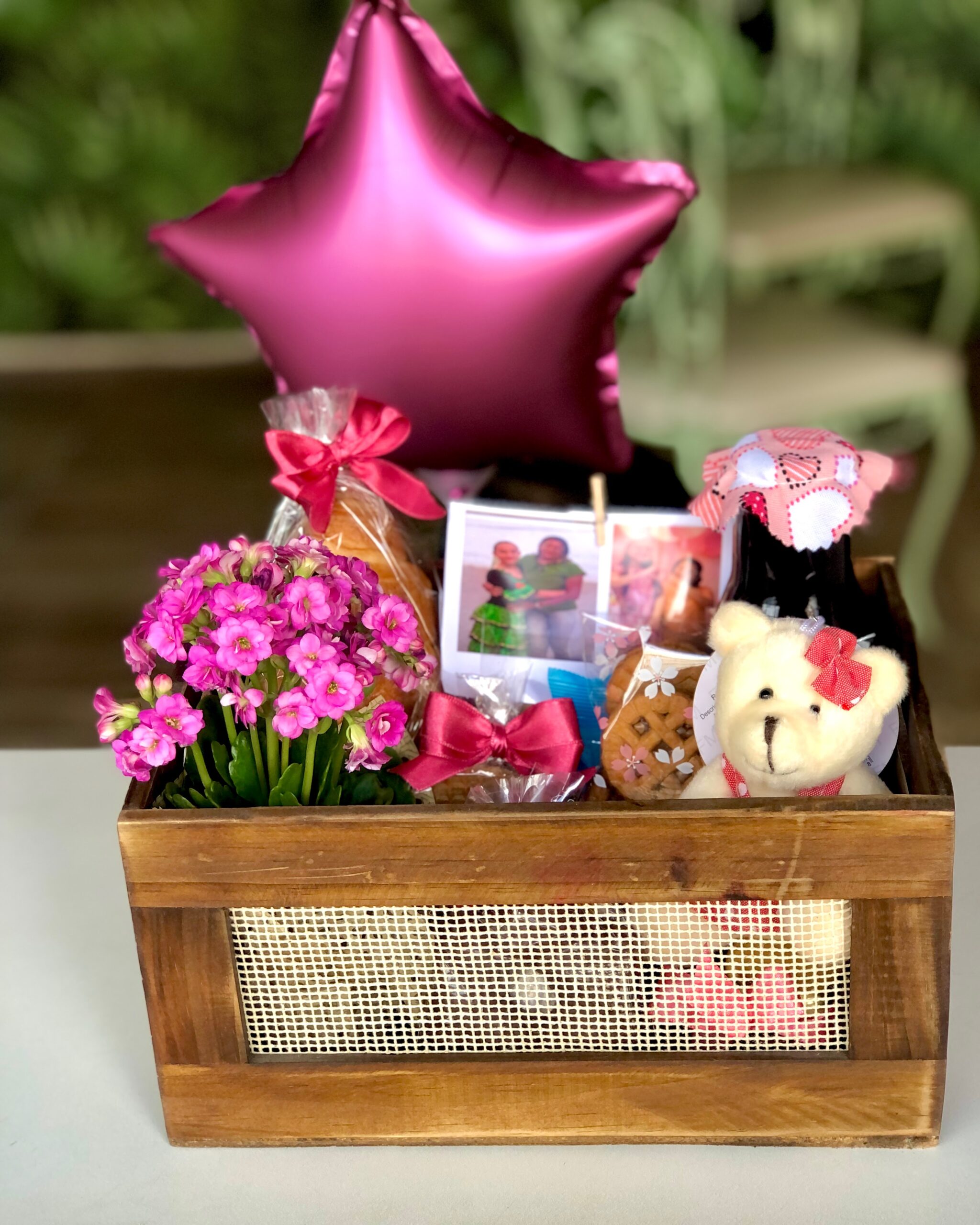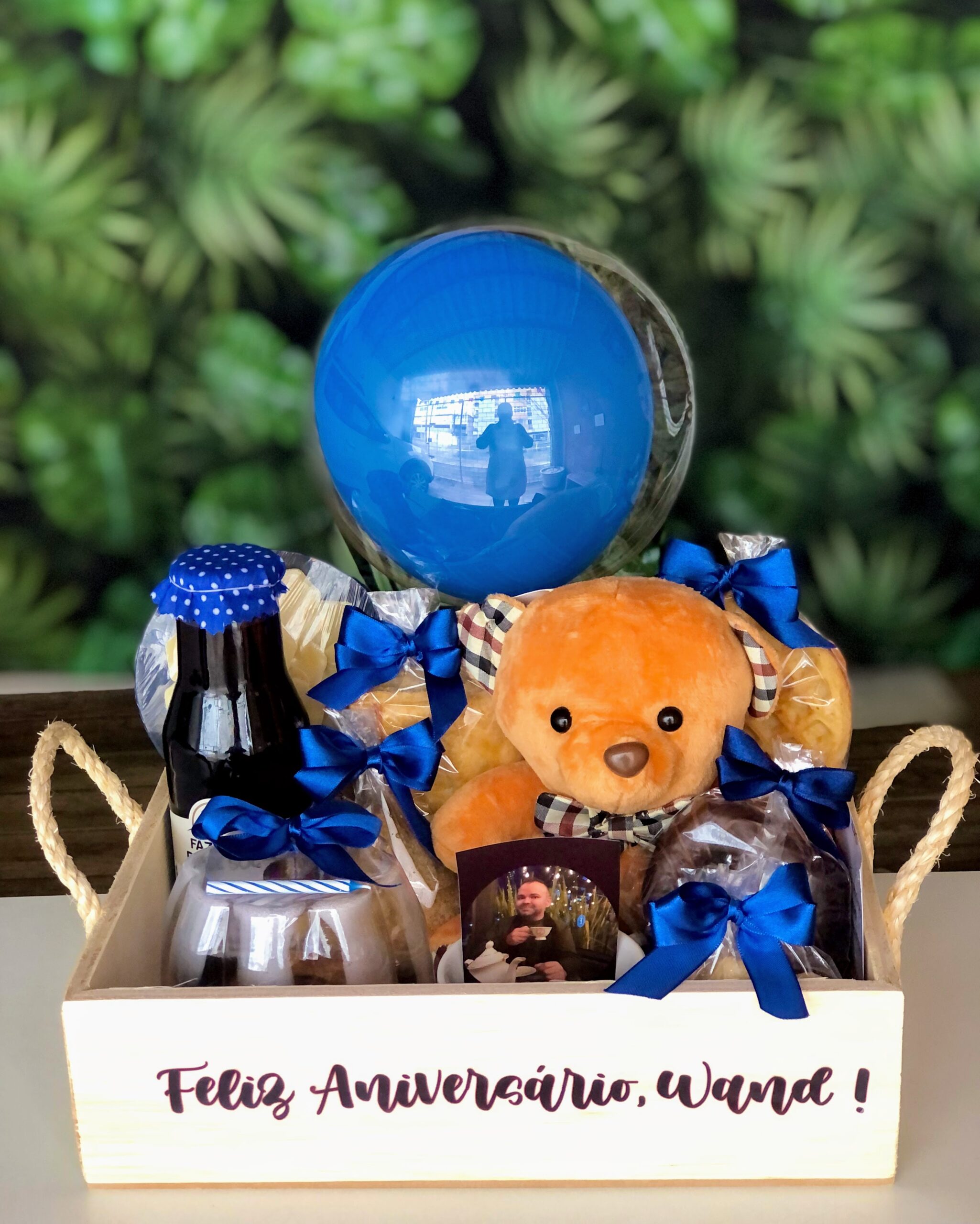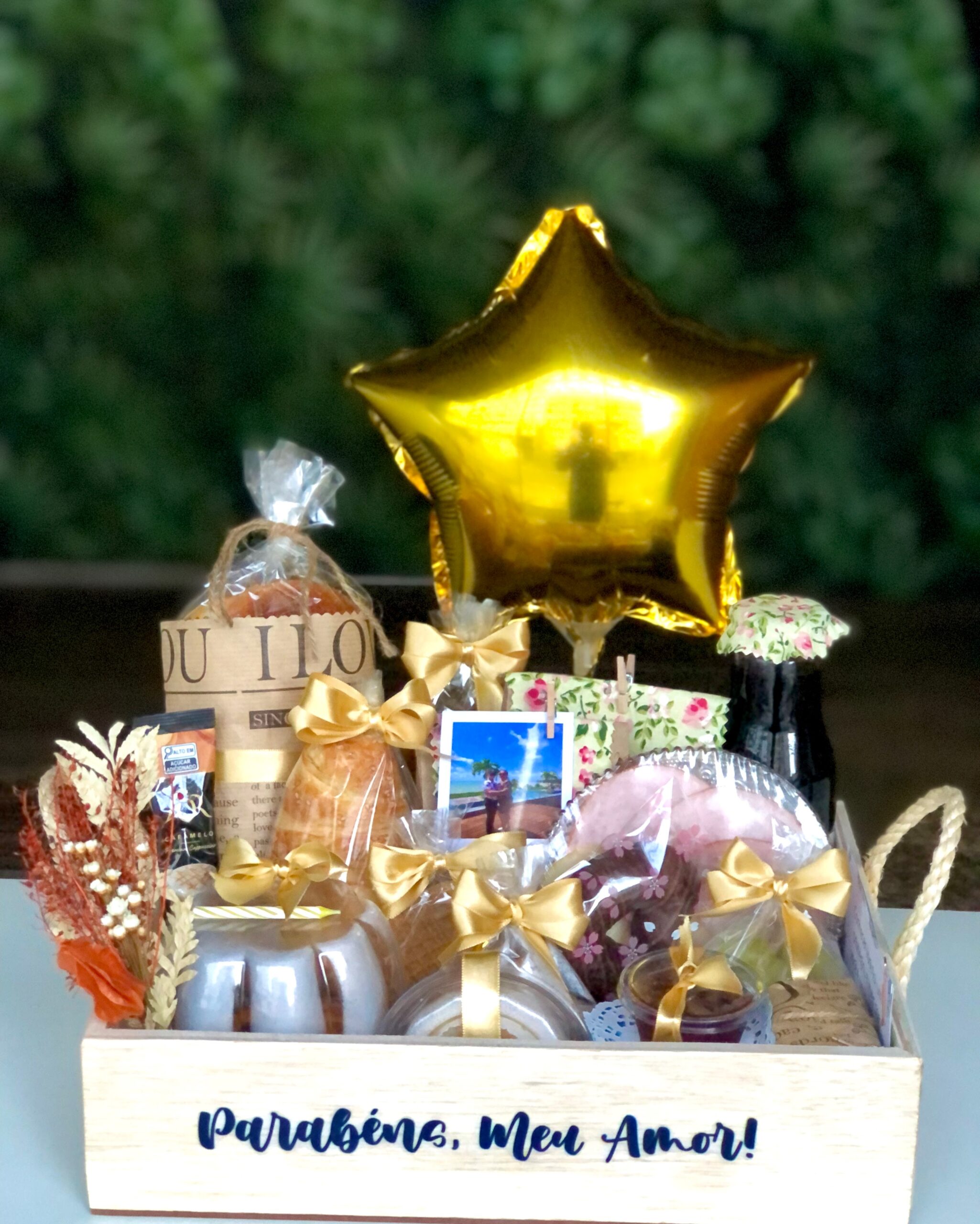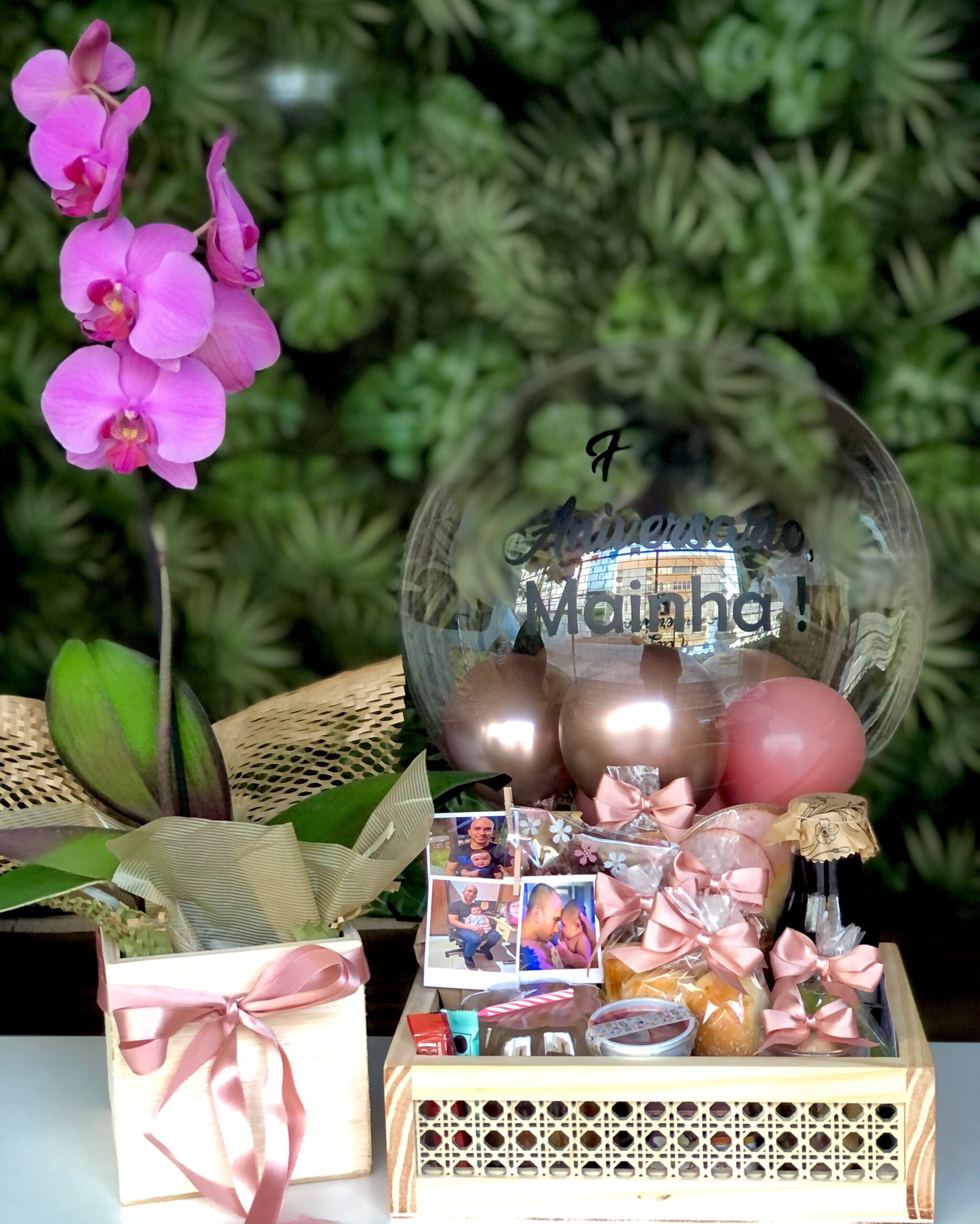 📸 Foto + 💌 Mensagem + 🎈 Balão Metalizado + ✍️ Frase no caixote